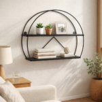 Enhance your home décor with this elegant black circular Modern Metal Wall Shelf designed for both style and functionality. Crafted from durable powder-coated metal, this modern two-tier wall shelf offers a sturdy and rust-resistant storage solution for displaying plants, books, photo frames, candles, and decorative items. Its unique circular frame and minimalist design make it a perfect fit for living rooms, bedrooms, offices, hallways, and modern interiors. The wall-mounted structure helps save space while adding a sophisticated decorative touch to any wall. Easy to install and built for long-lasting use, this stylish shelf is ideal for organizing and beautifying your home effortlessly. 🏡✨