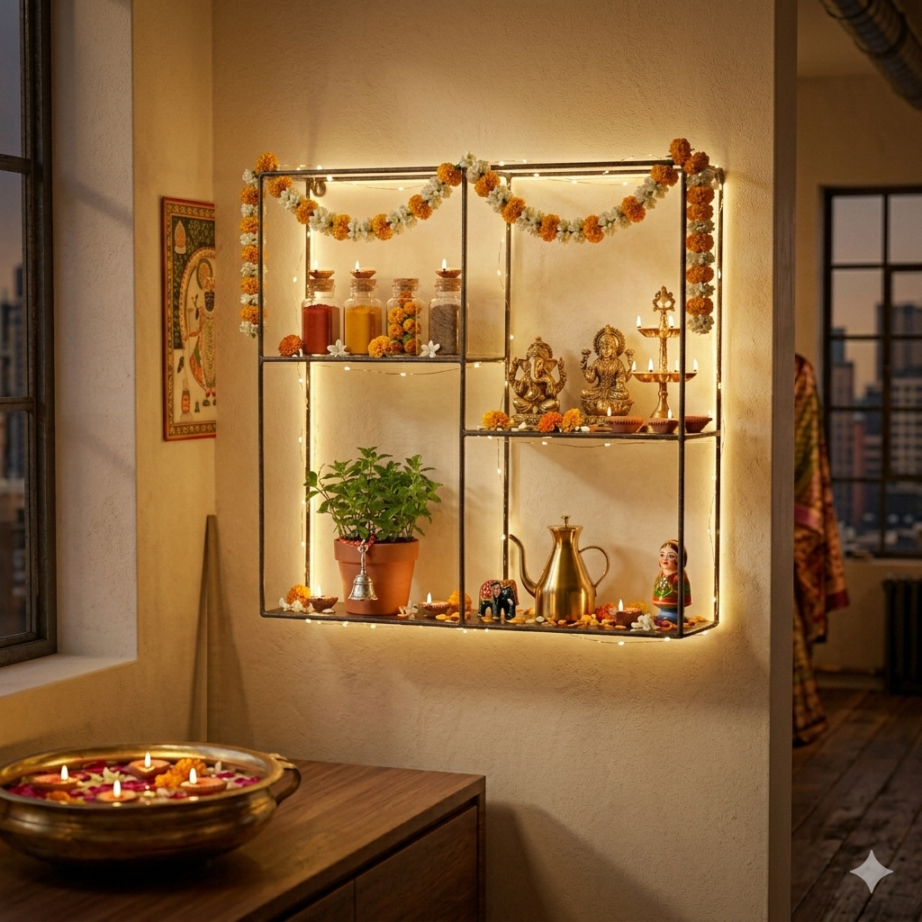 Celebrate elegance and tradition with this beautifully styled Metal Wall Shelf Organizer, designed to enhance your festive home décor. Crafted in a sleek black metal frame, this wall-mounted shelf becomes a stunning focal point when adorned with glowing diyas, brass décor accents, delicate idols, and warm fairy lights. The soft golden lighting creates a rich, inviting ambiance that perfectly complements Indian festive celebrations like Diwali, housewarming ceremonies, or special family gatherings. Scattered flower petals and traditional elements add a luxurious cultural charm while maintaining a clean, modern aesthetic. Its geometric structure keeps the arrangement balanced and visually appealing without looking cluttered. Mounted against a warm neutral wall, the shelf blends contemporary design with timeless tradition. Both decorative and functional, this premium wall shelf transforms empty wall space into a radiant display of style, spirituality, and sophistication, making your living room feel warm, welcoming, and beautifully festive.