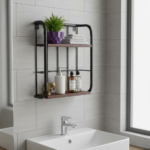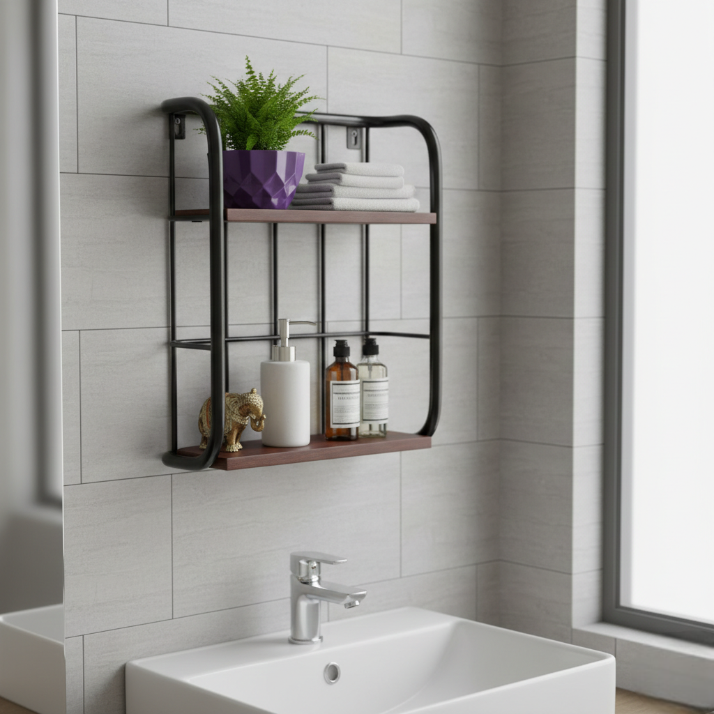 Upgrade your home organization with this stylish wall-mounted metal and wood 2 tier wall shelf. Designed with a sturdy black metal frame and rich wooden base, it offers durability with a modern industrial look. Its compact size makes it perfect for bathrooms, kitchens, bedrooms, or living rooms—ideal for storing toiletries, small plants, decor items, spices, or essentials. Easy to install and space-saving, this versatile shelf keeps your items neatly organized while enhancing your wall décor. A practical and elegant solution for small spaces, it blends functionality with contemporary style to suit any modern home interior.