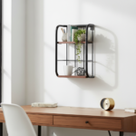 Crafted with a sturdy black metal frame and warm-toned wooden shelves, this piece creates a beautiful contrast that complements a wide range of interior styles — from modern and industrial to minimalist and Scandinavian. Its compact dimensions make it ideal for tight spaces while still offering ample storage for decorative and functional items.
