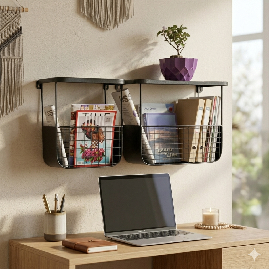 This metal wall shelf organizer helps reduce clutter and promotes an organized lifestyle — turning messy corners into visually pleasing storage zones.