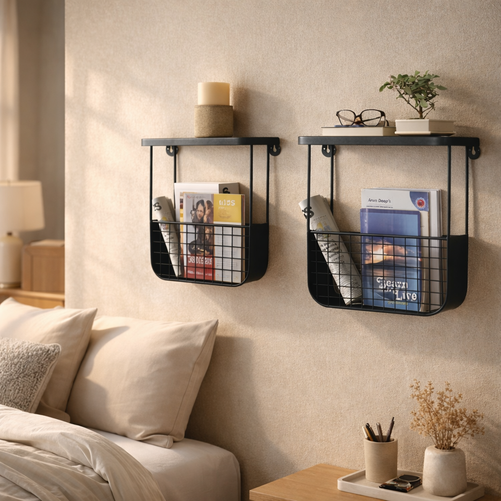 Perfect as a bedside wall organizer for books, journals, glasses, or nighttime essentials.