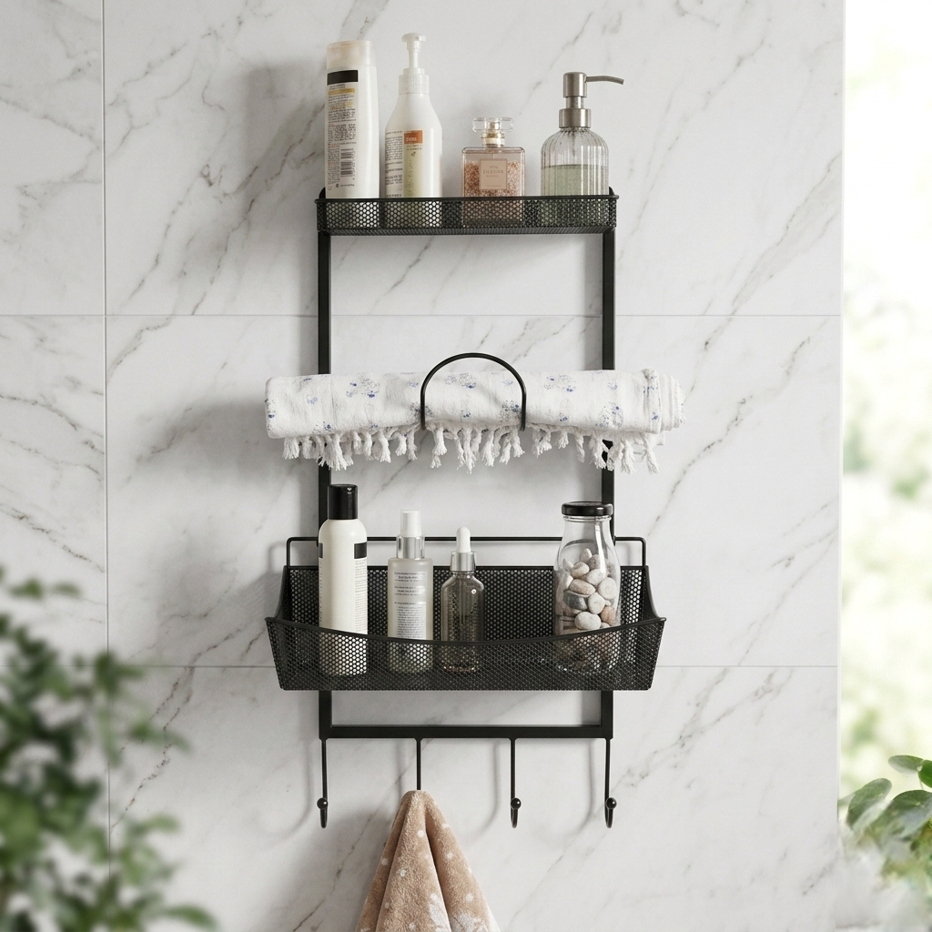 Organize your space with this premium metal wall shelf with hooks, designed for durability and modern style. Made from high-quality powder-coated metal, it is rust-resistant, sturdy, and perfect for everyday use. The organizer features a top shelf, spacious storage basket, towel holder, and four strong hooks, providing convenient storage for toiletries, kitchen items, keys, towels, and accessories. Its space-saving wall mounted design helps keep your home neat while maximizing vertical storage. Ideal for bathrooms, kitchens, entryways, bedrooms, or laundry areas, this stylish black wall organizer adds both functionality and elegance to any interior décor while keeping essentials easily accessible.