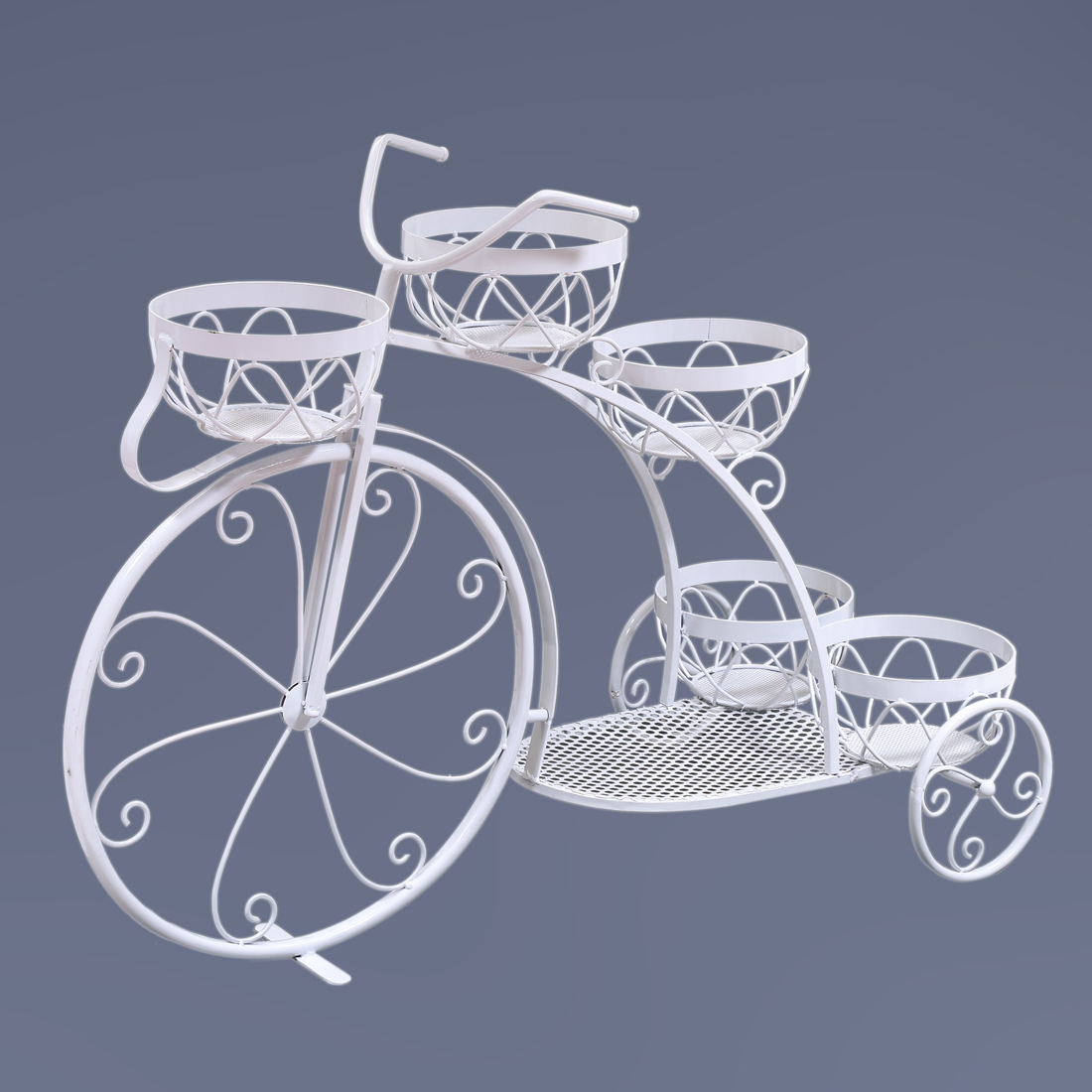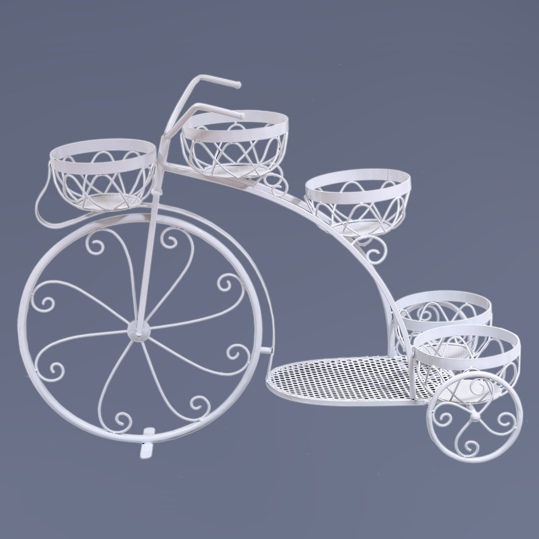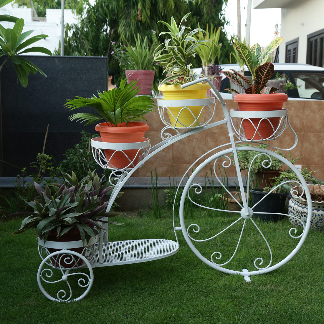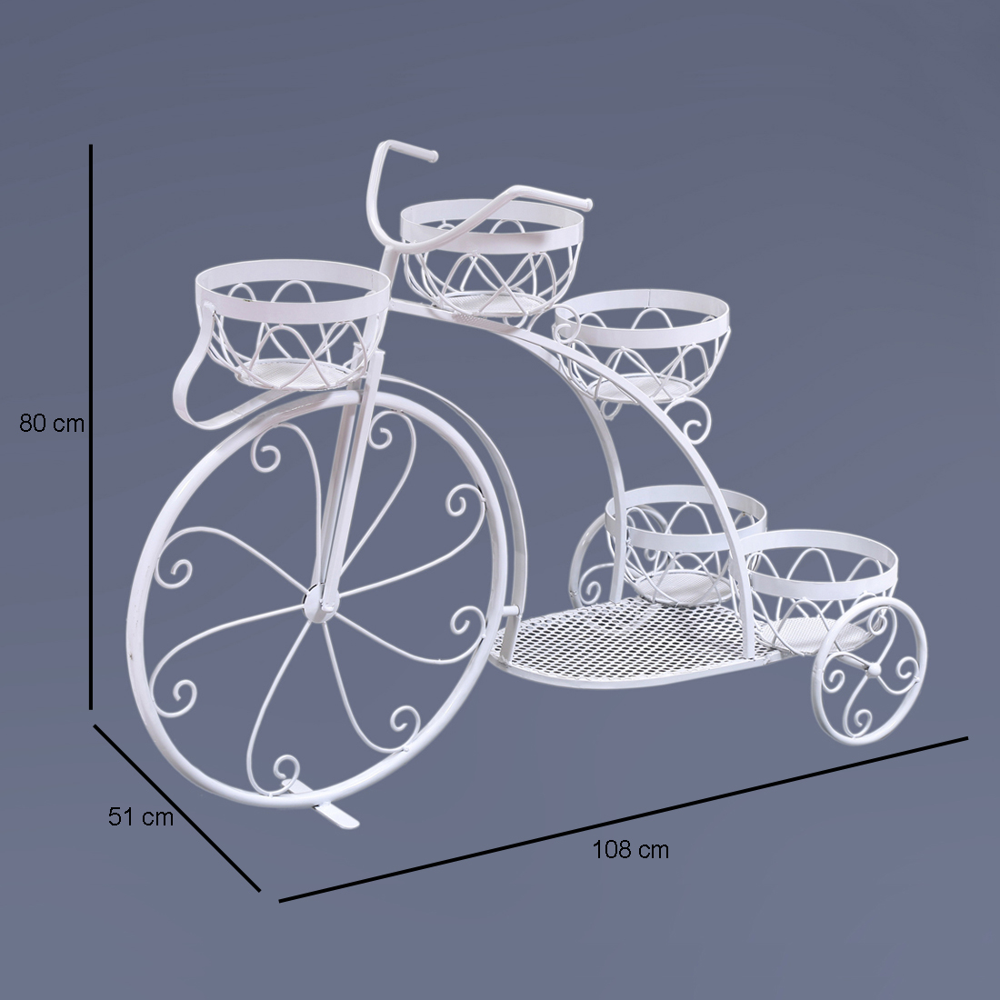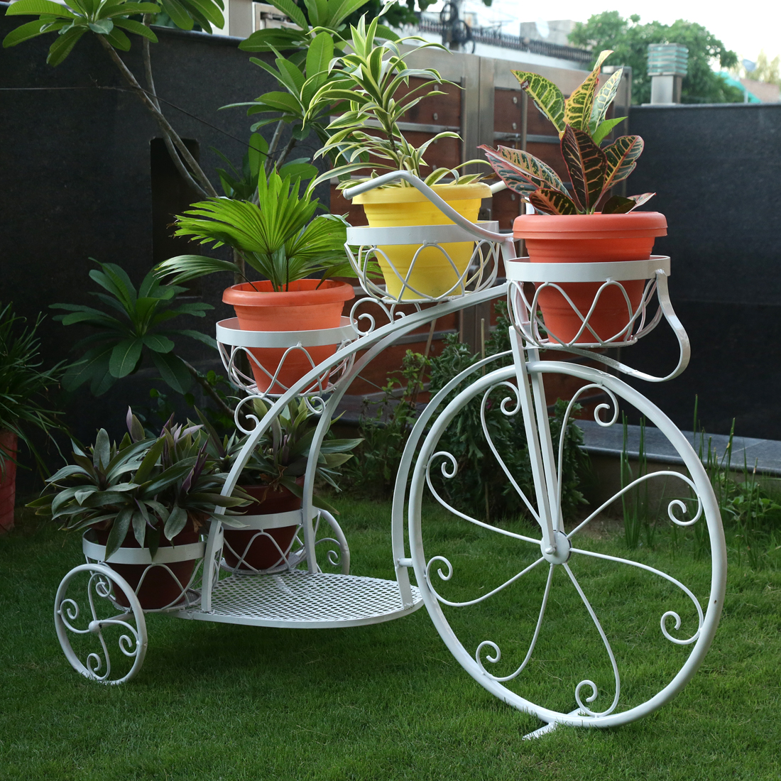Elegant white color metal bicycle plant stand with a vintage design, featuring 5 round planter holders arranged across a sturdy tricycle frame. Ideal for indoor & outdoor décor, balconies, gardens, living rooms, and patios. Durable iron construction with a smooth powder-coated finish adds charm while neatly displaying multiple plants in one stylish setup.