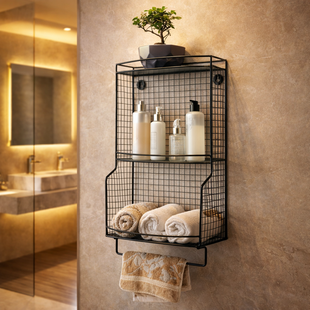 Upgrade your home organization with this modern powder-coated metal wall shelf with hanger, designed to combine style, strength, and smart storage. Crafted from high-quality durable iron, this wall-mounted organizer provides a practical solution for keeping your everyday essentials neatly arranged while enhancing your interior décor.